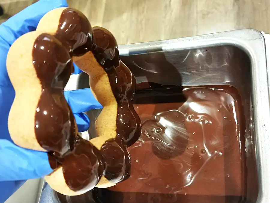 続いてポン・デ・リングにチョコソースをかけます。つやつやで美しい…。