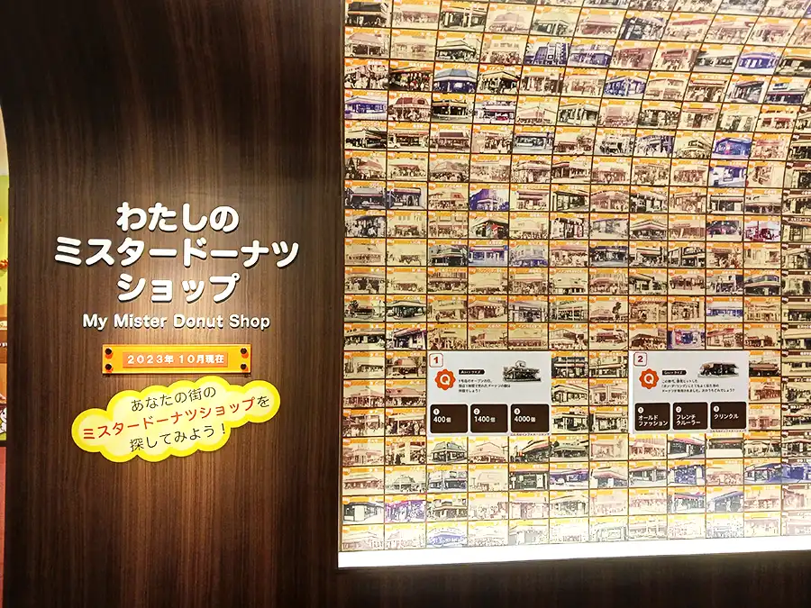 続いて全国のミスタードーナツの店舗の写真が、半ドーム型の壁面に一堂に並んだ「わたしのミスタードーナツショップ」。