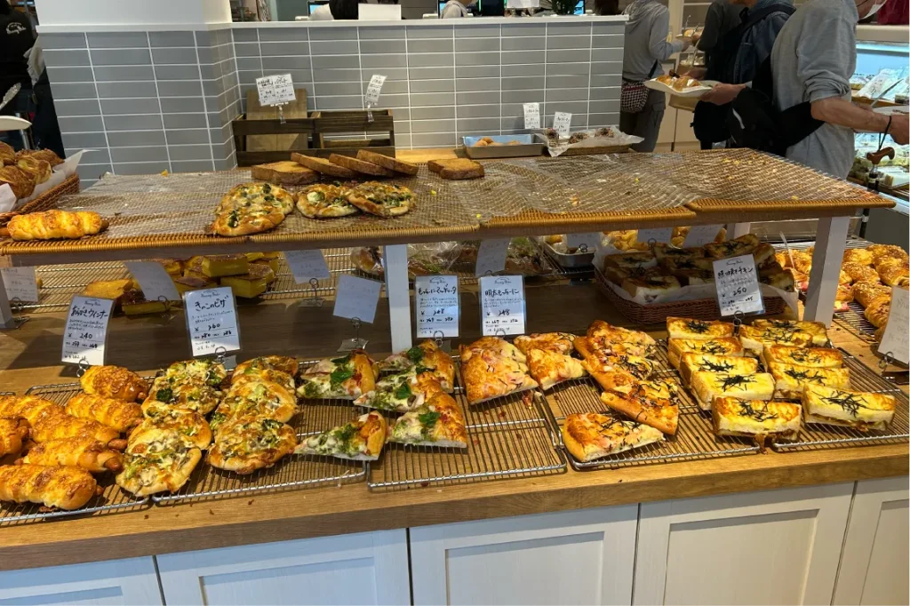 到着したのは9時台でしたが、店前には長い行列!入場制限中でしたが、5分程度待てば入店することができました。店内の左手にあるトレーとトングを取り、流れに沿って進みます。パンは惣菜系からスイーツ系、サンドイッチに食パンなど、実に多彩。白を基調とした明るく北欧チックな内装で、よりパンがおいしそうに感じられます。