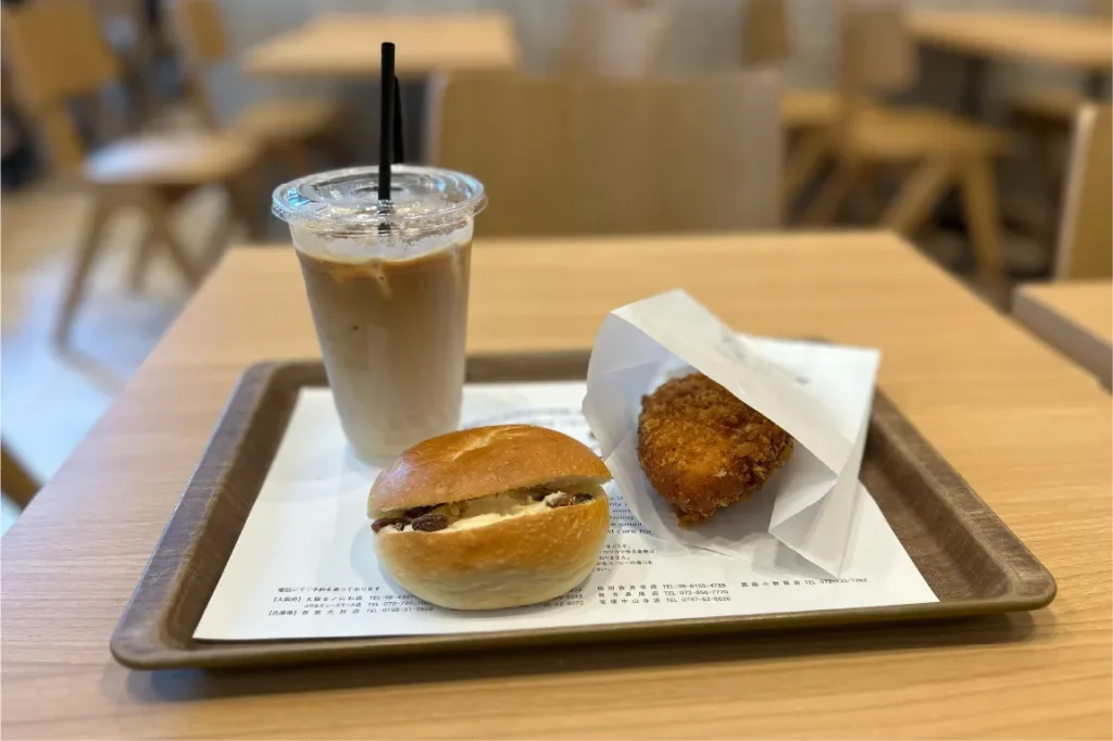 キャッシュレスにも対応しているセミセルフレジで会計を済ませ、イートインコーナーを利用しました。窓際のカウンターは人気だったため、2人掛けテーブルに着席。大ファンのカレーパンとラムレーズンベーグル、カフェオレで、大満足のモーニングです。