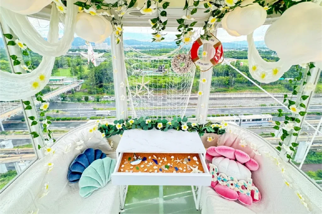 現在、9月30日(火)まで夏季限定の特別仕様「そらカフェ」が運行中!季節ごとに異なるアプローチで楽しませてくれる“カフェ観覧車”シリーズの流れを汲んだもので、限定ドリンク、または涼やかなかき氷付きカフェセットを特別内装のゴンドラで味わうことができます。