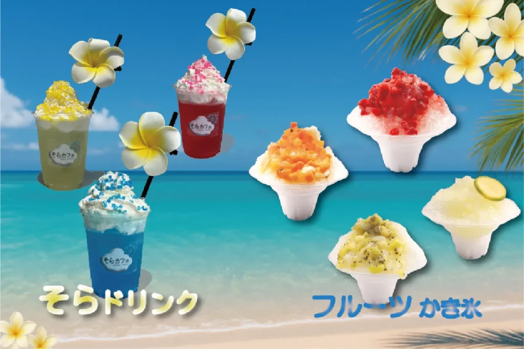 限定ドリンクの「そらドリンク」は、マンゴーソーダ、ストロベリーソーダ、そしてブルーレモネードがスタンバイ。フルーツの食感も味わえるかき氷は、マンゴー、イチゴ、キウイ、レモンの4種類です。