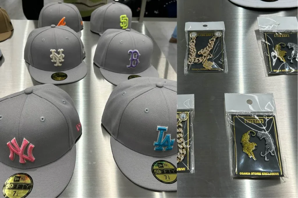 特に、「THE CAP」別注のNEWERAが全体の40%も占めており、これは日本で唯一の店舗なんだそう!ららぽーとEXPOCITY店限定のカスタムキャップや、大阪らしさを落とし込んだ同店限定の虎モチーフのピンズなども並びます。