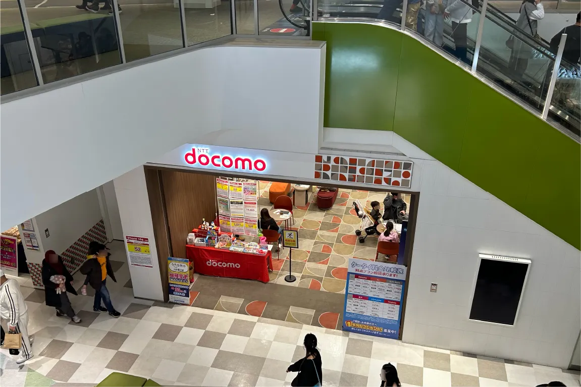 今回ピックアップした「docomoショップ」は、グリーンサイド1F、エスカレーター下に位置します。大きな出入口が2カ所あり、開放的なムードが特徴。新たに加入する場合はもちろん、ユーザーも料金プランの見直しなど、気軽に遊びにいけそうです♪