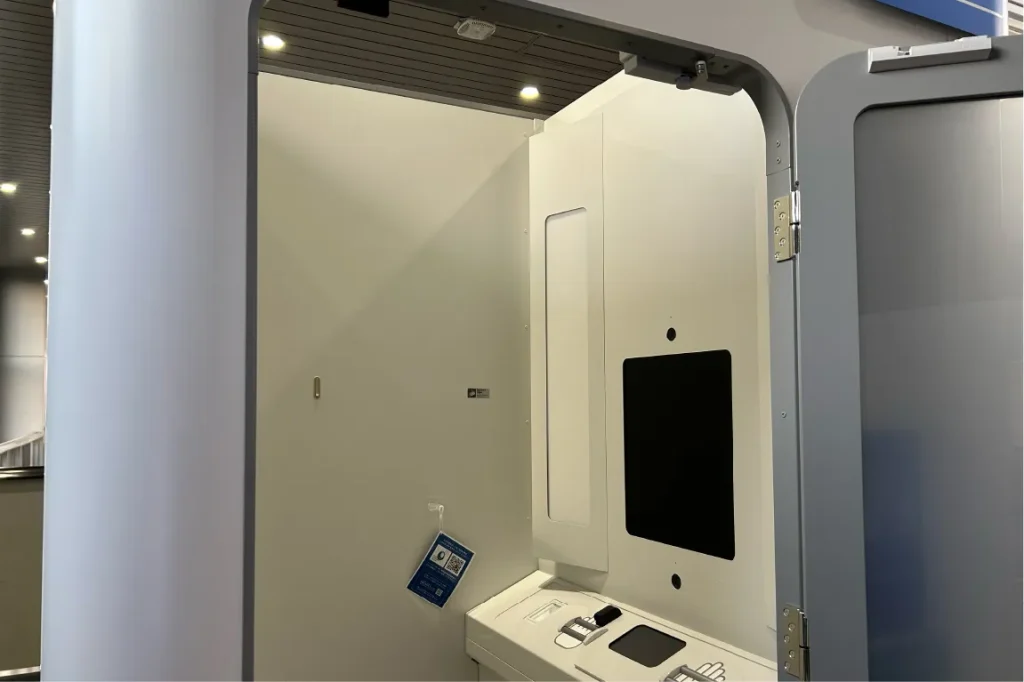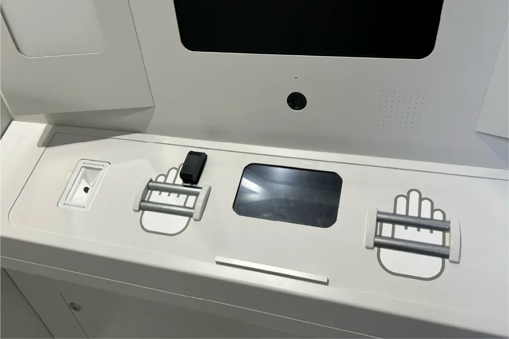 証明写真の機械のようなコンパクトな内部には、画面と手をかざして測定するスペースがあります。この測定器やカメラを用いて、7領域の健康データを取得することができるというから、驚きです。時間にして約5分とのこと。利用可能時間は11〜17時30分までとなり、測定には無料アプリのダウンロードが必要になります。ぜひ体験してみてはいかが?