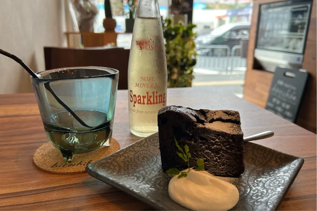 オーダーしたのは、ガトーの甘酒ホイップ添えと、能勢酒造のジンジャーエールです。大きめカットがうれしいガトーショコラは、食べ応えもありつつカカオ感たっぷり。添えられた甘酒ホイップとの相性も抜群です。これでグルテンフリーとのことで、さらに驚き!ちょっと気温の高かったこの日、爽やかなジンジャーエールもゴクゴク進みました。