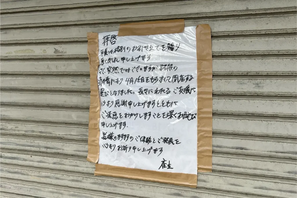 千里山駅の西側の上り坂を少し上がった場所にあった、きれいなブルーのひさしが目を引く「千里山の八百屋さん」。先日この前を通りがかった際に、シャッター前に閉店のお知らせが貼ってあることに気が付きました…!