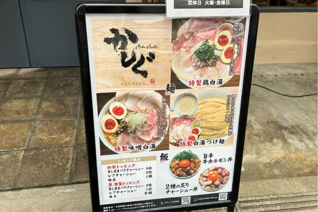 以前ご紹介した「らーめん これこれ」の新ブランドとして3月にオープンした「make noodle かしぐ」。江坂公園に面した「らーめん これこれ」の裏手にあり、土曜の開店時間すぐに訪れたところ、すでに店内は満席!2人のお客様が並んでいるところでした。