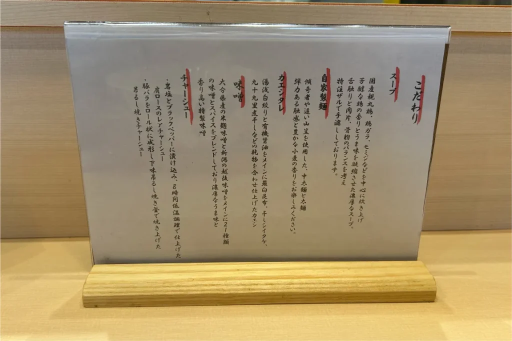 スタッフの方が声をかけてくださり、まずは店内の券売機で食券を購入してから、列に並びました。タイミングがよく5分ほどで入店。白木のカウンターの向こう側にコンパクトなキッチンがあり、てきぱきとラーメンが盛り付けられていく様子を眺められ、待つ時間も退屈しません。