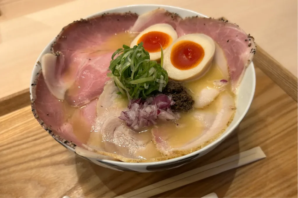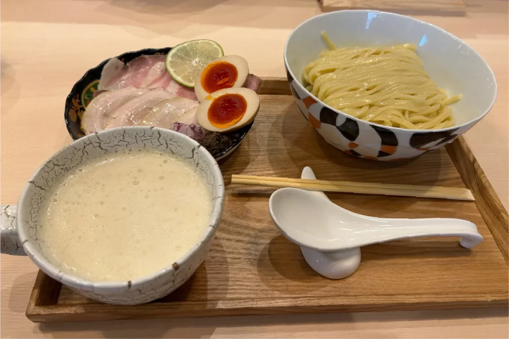 さらに、つけ麺もこれまた美味!小麦の香りが感じられる太めの平麺に、濃厚スープがぴったりで、刻み玉ねぎや煮卵などのトッピングもあって食べ応え抜群です。ラーメン、つけ麺ともにレアチャーシューと吊るし焼きチャーシューの2種が楽しめるのもうれしいポイント!