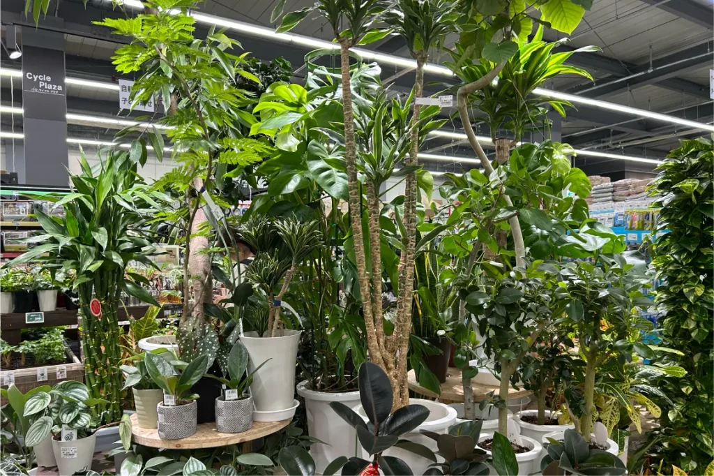 エントランス近くには、観葉植物がズラリと並び、まるでお出迎えしてくれているよう。イキイキしたグリーンの葉で、お部屋に迎えたくなること請け合いです。