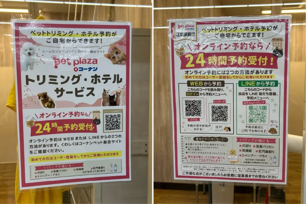 また、店舗の左側には、ペットショップ「ペットプラザ江坂駅前店」も併設されています。愛らしい子犬たちに足を止める人も少なくありません。また、トリミングやホテルサービスも行っており、駅近の立地ゆえ、便利に利用できそうです。