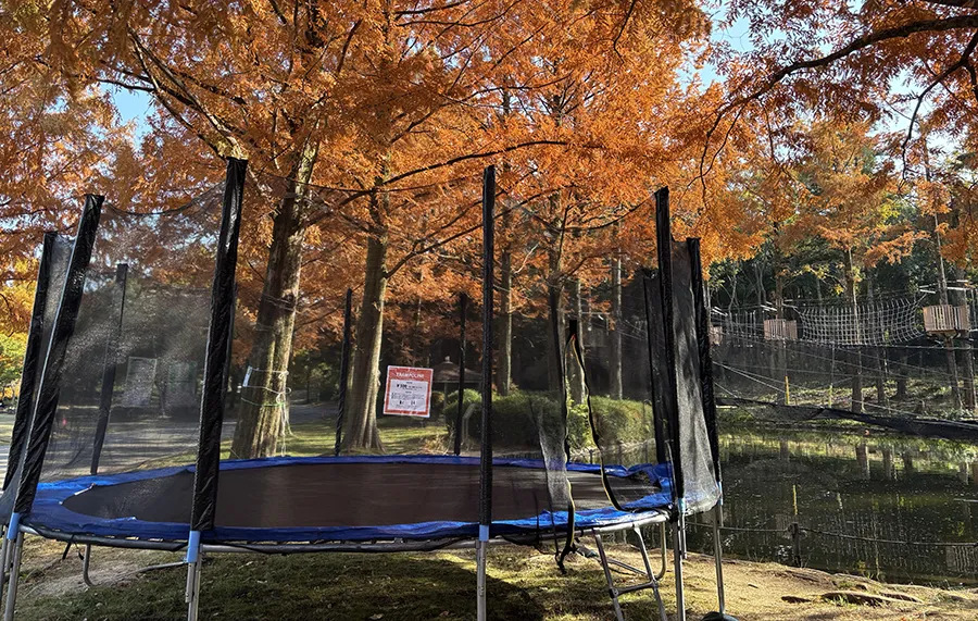 「ボウケンノモリ万博記念公園店」受付テント横に設置されたトランポリン。