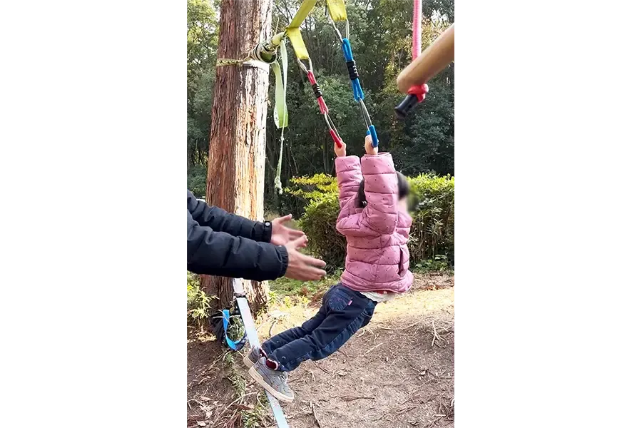 木と木の間に張られた細いベルト状のラインの上に立ち、頭上にぶら下がった吊り輪を掴んで移動していくちょっと難易度が高そうなアトラクションです。