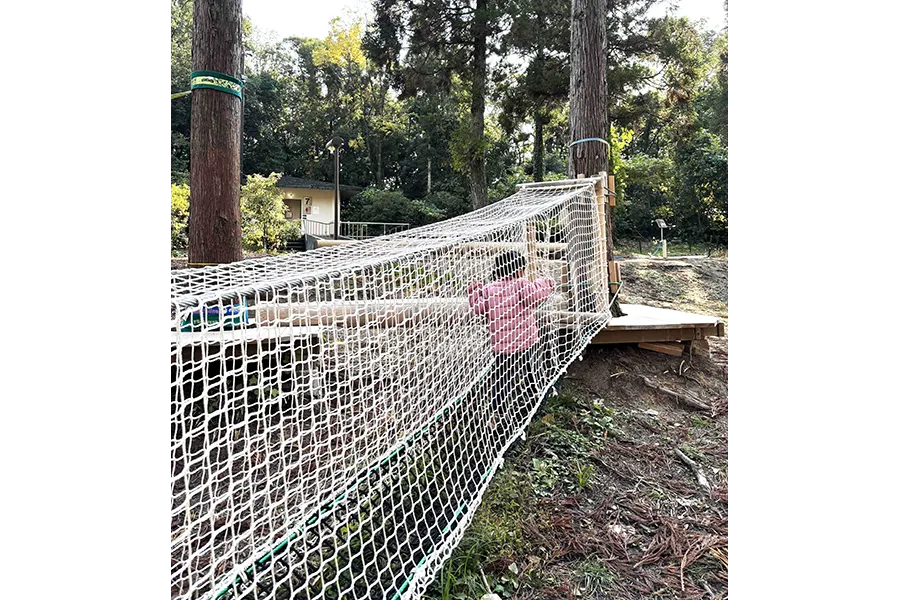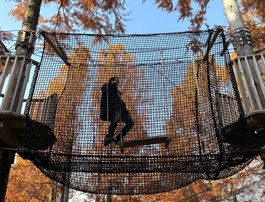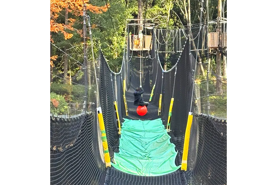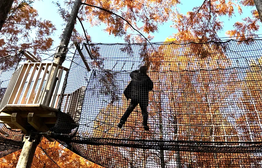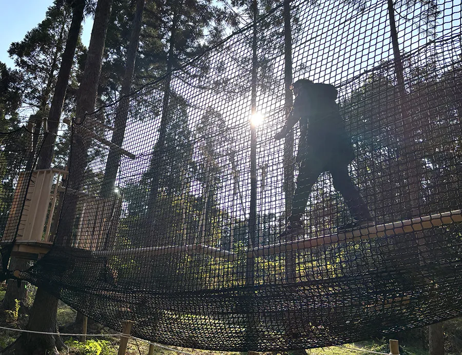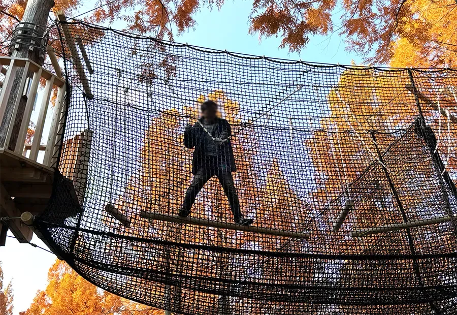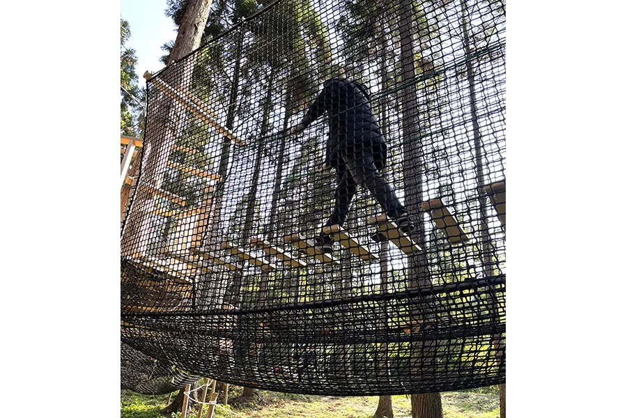高低差のあるコースでは万が一の落下に備え、足元にネットが張り巡らされているため、すべてのコースはノーハーネスで遊べるようになっています。
