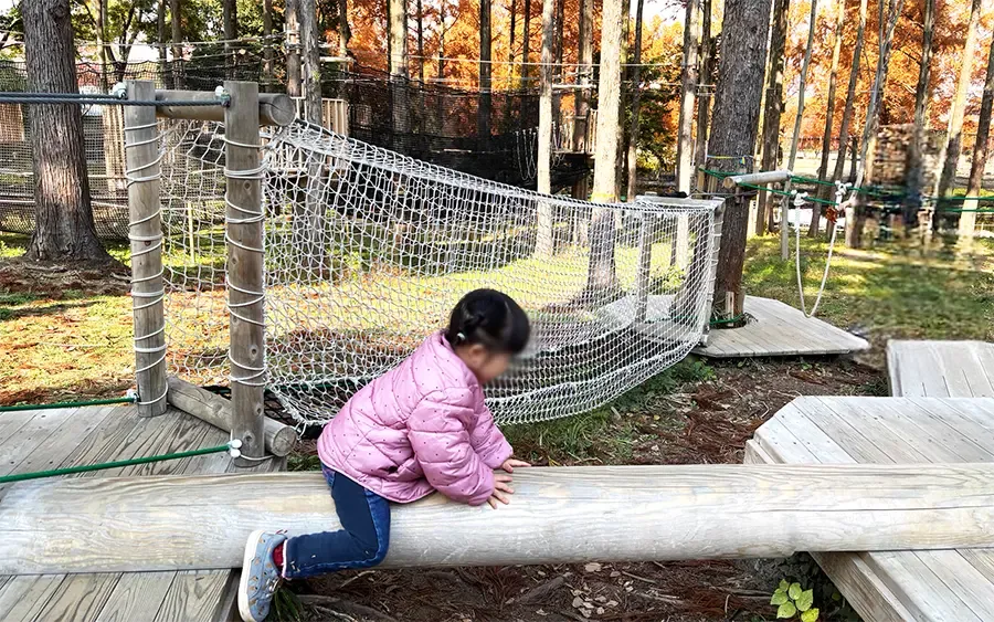 ピクニックコース最難関のアトラクションは、蛇のように曲がりくねったログの上を進んでいくもの。ロープで吊るされ、揺れるログの上で平衡感覚を保ちつつ進んでいくだけでも難しいのですが、このログがとても細く、このログからログへの移動がまた難しいんです!