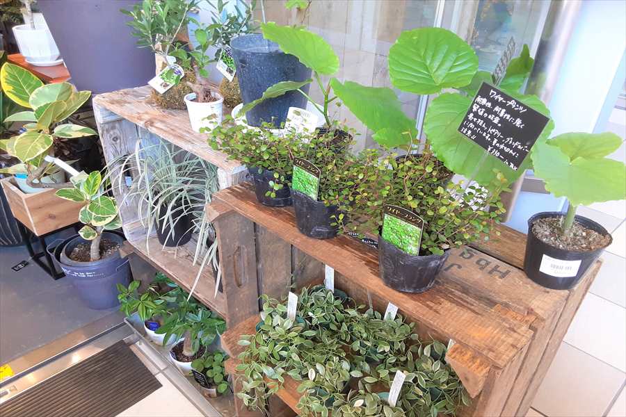 店内には「ワイヤープランツ」330円、「中国ガジュマル」1,100円~「コノフィツム」などの観葉植物や多肉植物、また小さな鉢植えなども販売されています。これなら気軽に始められそうですね。