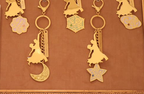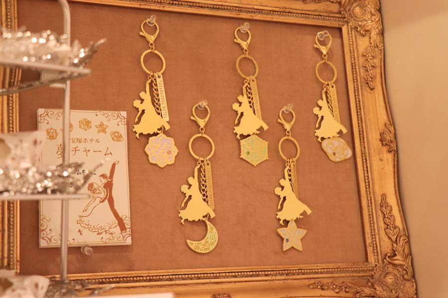 ダンスシーンを切り取ったゴールドのプレートに、宝塚ホテルのロゴが入ったネームプレート、花組、月組、雪組、星組、宙組の各組をイメージしたプレートが付いた、その名も「夢チャーム」。