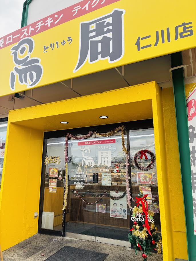 ロースターでじっくり焼き上げるローストチキン・フライドチキンのテイクアウト専門店「鳥周」。岡山の牟佐が発祥で、阪神競馬場のそばにある仁川店は15号店です。今年8月にオープンしたので、今度が初のクリスマス。店先から華やかにクリスマスのデコレーションで盛り上がっています。