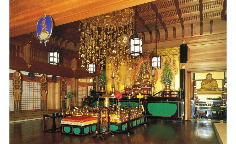 正面には、ご本尊の大日如来、向かって左は不動明王、右には弘法大師が祀られています。真言密教の象徴ともいえる大曼荼羅壇(だいまんだらだん)や舎利塔(しゃりとう)、密具が安置されています。