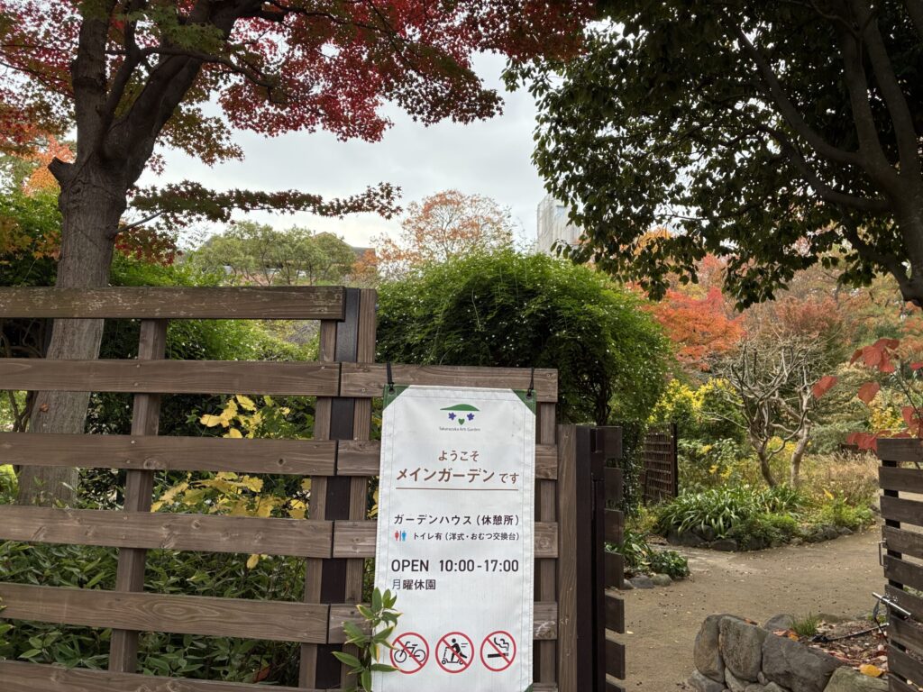 メインガーデンは、こぶりながら園内に飛び石を配した池やひとやすみにぴったりのベンチが備えてあり、お子さん連れや犬のお散歩、仕事の休憩をとるビジネスマンなどの姿を見かけます。奥に歩いていくとガラス張りの休憩所・ガーデンハウスがあります。おしゃべりしたり、お茶、お弁当を広げることができるテーブルセットがあって、寒くてもハウスの中で暖をとりながら美しい庭を見ることもできます。トイレ(洋式・おむつ交換台アリ)も完備されているので、ゆっくり過ごせます。取材日は日差しが暖かかったので私はハウスの外に置かれた黒いガーデンチェアに座ってしばらくのんびり。