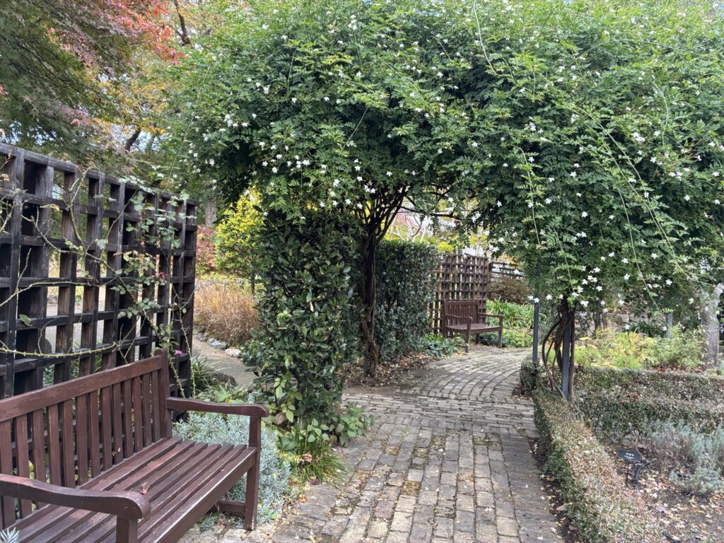 少し肌寒くなったものの、凛とした空気に包まれて、自然の美しさが引き立つこの季節。宝塚市文化芸術センターの施設であるメインガーデンで午後のひとときを過ごすことをおすすめします。というのも、桜や薔薇のような華やかさはないものの、ガーデン内を彩るアーチに小さい白い花が咲き乱れています。これはマツリカの花。漢字で書くと茉莉花、そうジャスミンの花です。香りが良いことは、お茶や香水でご存じでしょうが、本来の花の香を嗅いでみたいと思いませんか。