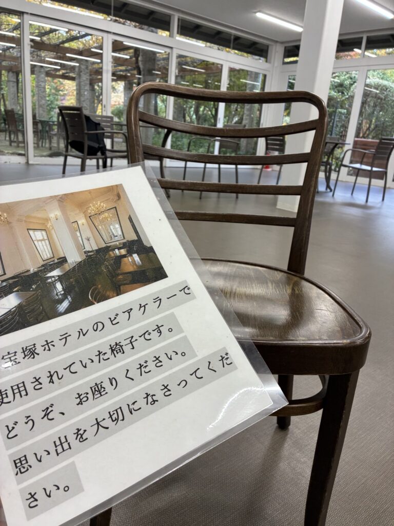 そしてハウス内に並んだ、古びていながらも趣のある椅子が気になりました。旧宝塚ホテルにあったビアレストラン「ビアケラー」で使用されていた椅子だそうで、長年、愛されたことがわかる傷み具合です。昔、訪れた際の記憶がぼんやりながらよみがえりました。