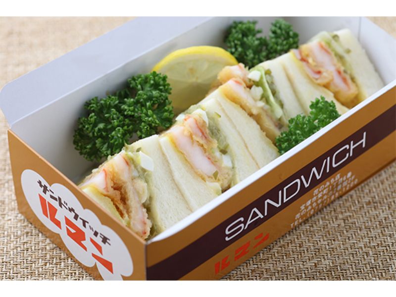 観劇の幕間に気軽に食べるには、テイクアウトを。どのサンドイッチもテイクアウトできるので、事前に注文しておくことがベター。かわいい箱に入れてテイクアウトできるので、ぜひ注文してみて。「海老フライサンド(2尾)」1,415円。