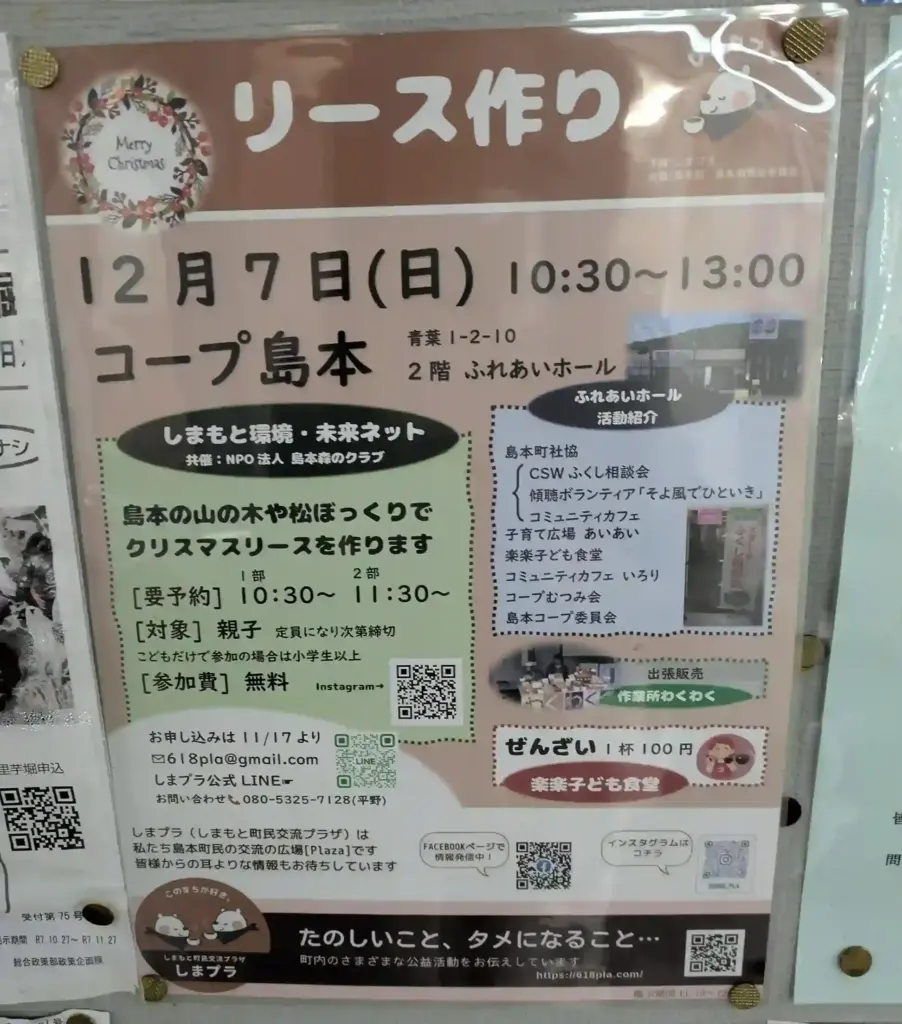 12月7日(日)に、コープ島本の2階ふれあいホールで、クリスマスに向けた親子向けの『リース作り』のワークショップイベントが2回開催されます。