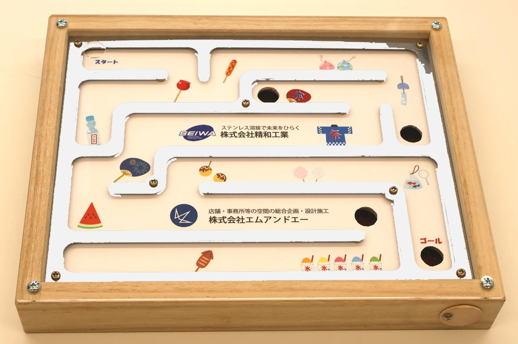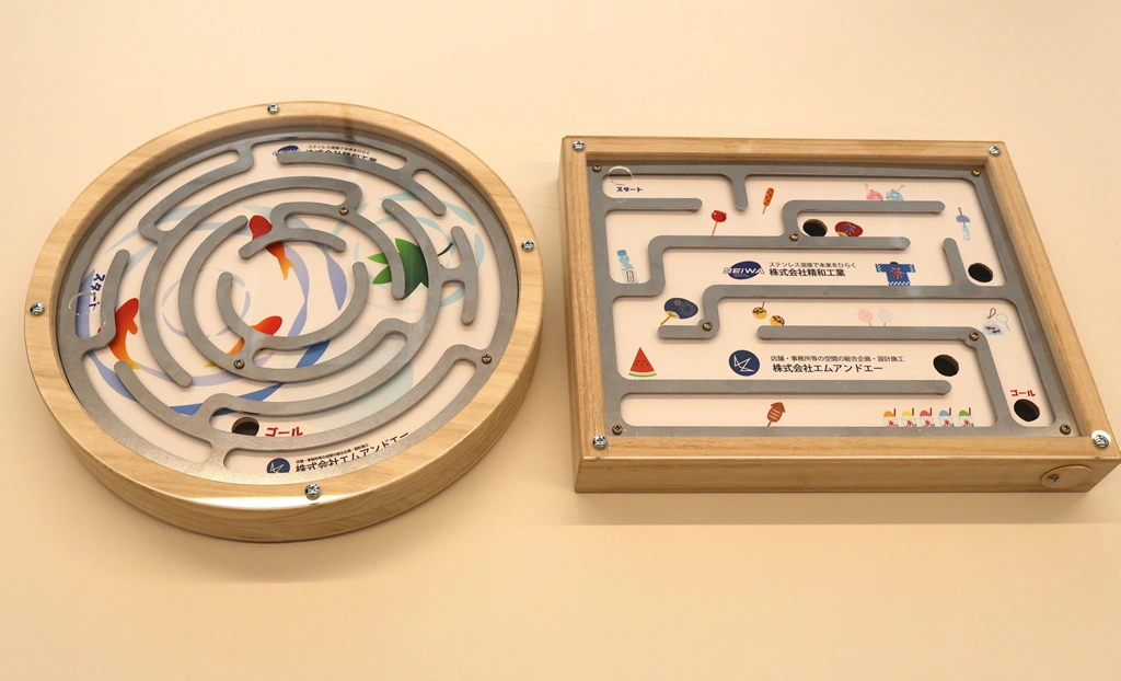 「立体迷路」(無料)は、ステンレス加工で作られた迷路の道を、エムアンドエーが作成した木製の枠に入れて作成されています。ビー玉ではなく鉄球やナットが使われ、工場らしい演出になっています。難易度は5段階あります。