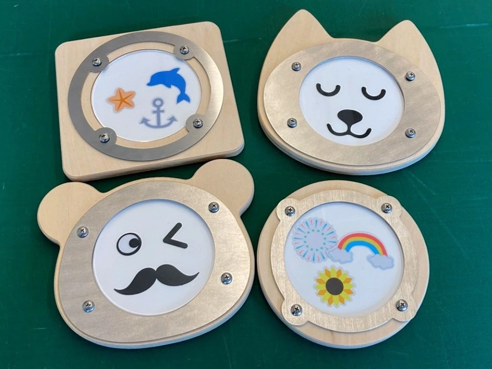 「コースターづくり」(1回300円)は、木のフレームにアクリル板をはめ込み、上からステンレス板をネジで固定する体験型ワークショップ。ネジを外せばデザインを入れ替えることも可能で、長く楽しめる作品になっています。