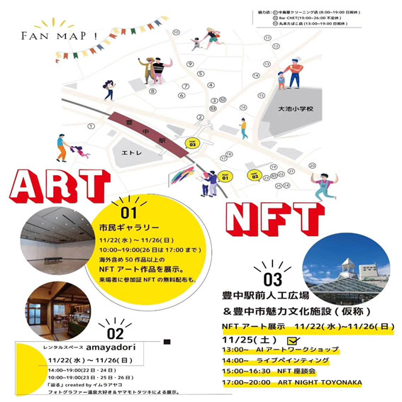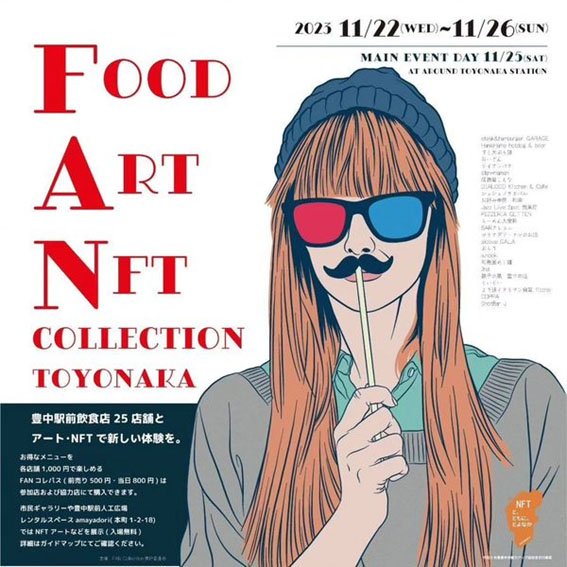 「FAN COLLECTION TOYONAKA」はFOOD・ART・NFTをテーマにまちの魅力を発信するイベントで、豊中市魅力アップ助成金交付事業の一つ。魅力文化施設ではNFTアートの展示やライブペインティングなどが行われる。