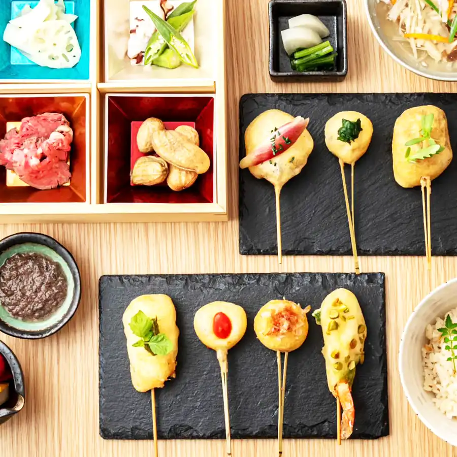 「創作串揚 べにゑ」のランチコースでは、すき焼きイメージの串や柚子の香りを付けたカプチーノソースの串など、見たことも聞いたこともないような楽しい創作串揚げを楽しむことができます。