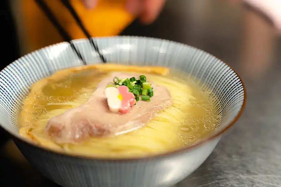 「鯛塩そば灯花(とうか)阪急西宮ガーデンズ店」でいただきたいのはやっぱり「鯛塩らぁ麺」! 美しく盛り付けられたラーメンに、女性ファンが多いのも納得のビジュアルです。