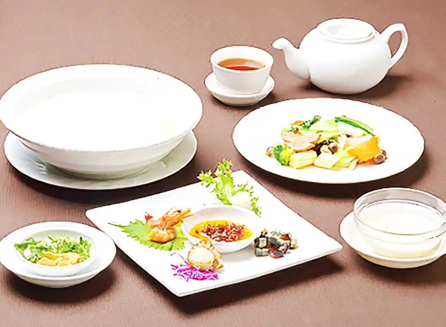 鯛の刺身やピータン、帆立貝柱の甘露煮など5種類のトッピングとともに楽しめる中華がゆは「廣東料理 水蓮月 西宮ガーデンズ店」でもぜひ味わって欲しい名品です。青菜炒めや本日のデザートなどもつくので、食べ応えもバッチリ!