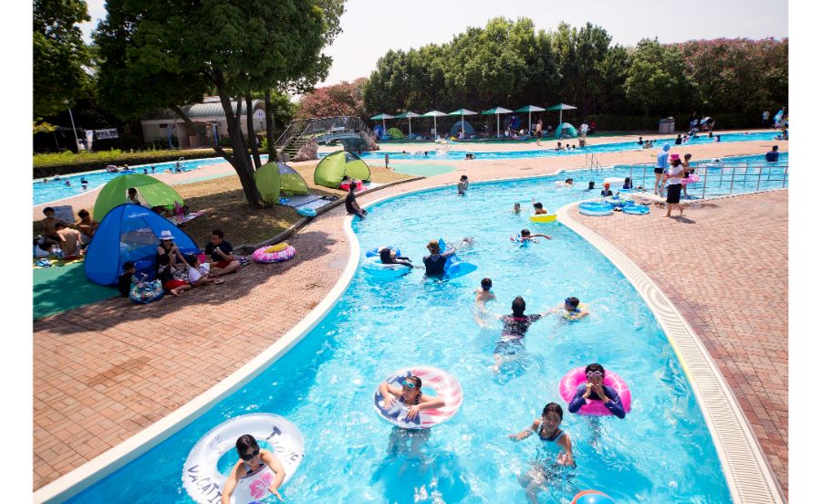 「円形花壇」から8時の方角、服部緑地でも最も西南にあるのが「服部緑地ウォーターランド」です。屋外プールのため、利用期間は夏の7~9月(年によって利用日が変わるため詳細はホームページで確認ください)。