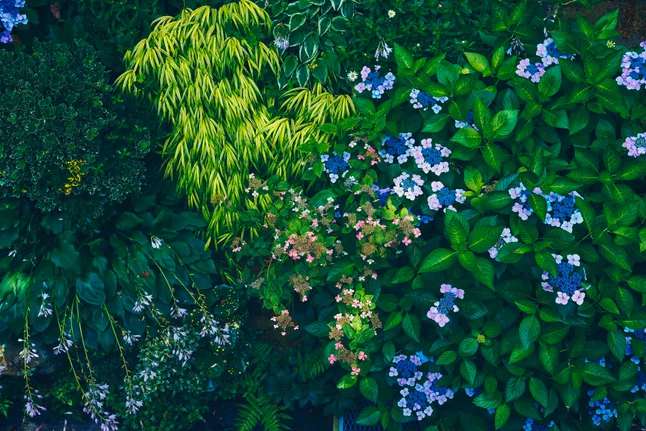 紫陽花の見頃は、6月中旬から7月下旬頃まで。白やブルー、ピンク、紫など色とりどりのアジサイが、涼しげな風景を作り出している。様々な種類のアジサイと、ハーブや草花との競演も楽しんで。