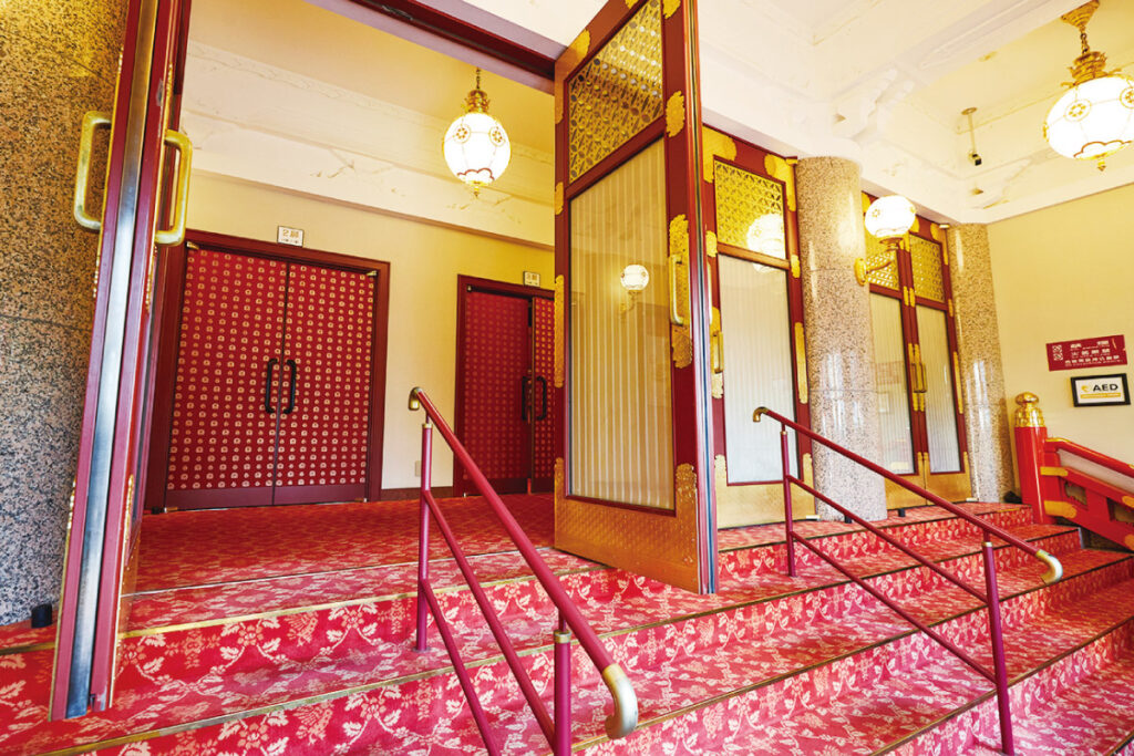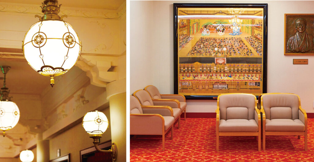 舞台上部の唐破風(からはふ)、提灯、朱塗りの欄干、各所に施された飾り金具など、空間を構成するディテールも見どころ。