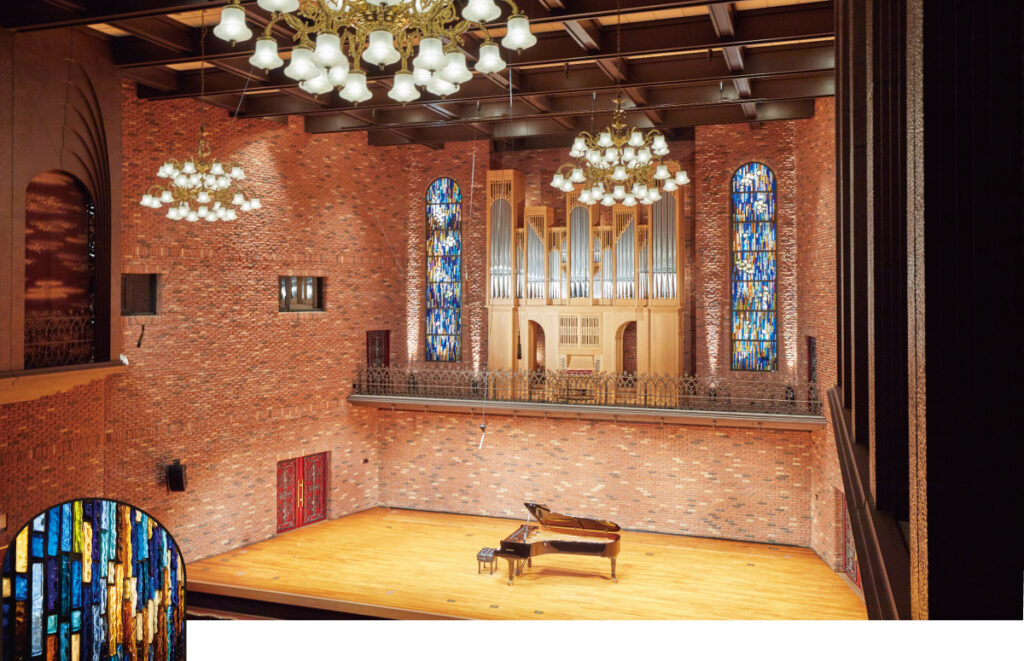 そんなのどかな風景とうってかわって、ホールの重い扉の向こうに現れるのが、パイプオルガンや豪華なステンドグラス、シャンデリア、壁一面のレンガ。風格のある重厚な佇まいに、思わず歓声を上げてしまう。