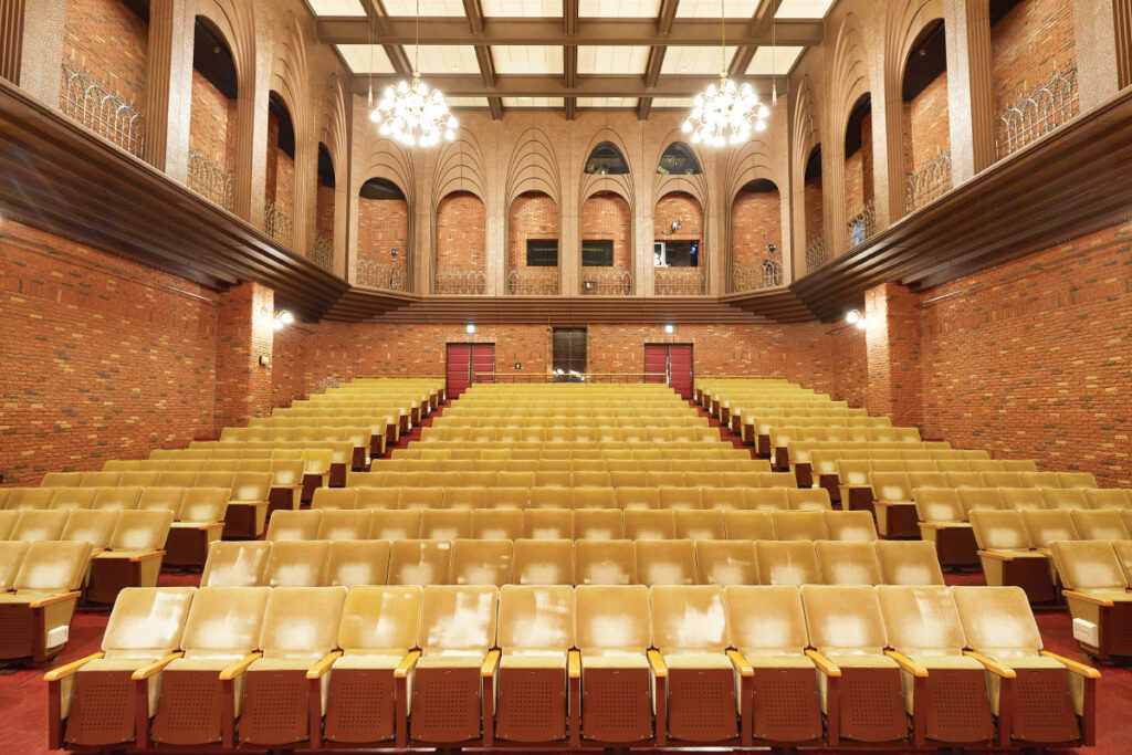 「ホールの内装は、音響効果を考えて素材や形が決まったと聞いています」と、案内してくれたのは館長の沖野さん。例えば手割りしたレンガの表面が音を反射することで、どの席からも良い音が楽しめるようになっているそうだ。