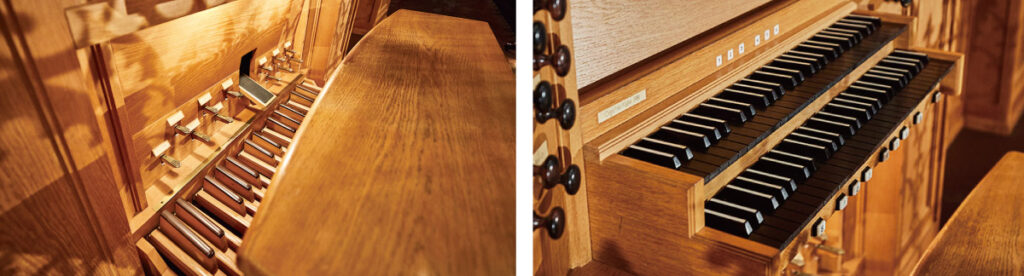 2段の手鍵盤と足鍵盤があり、音の強弱は足元中央のペダルでつける。