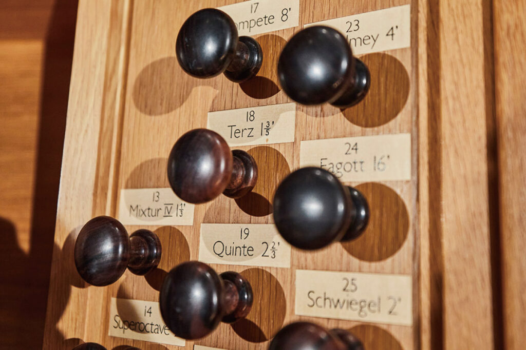 鍵盤の両脇にある音色を選ぶノブのこと。トランペットやファゴットなど24のストップがある。