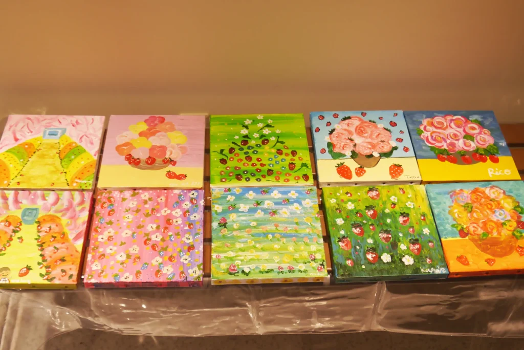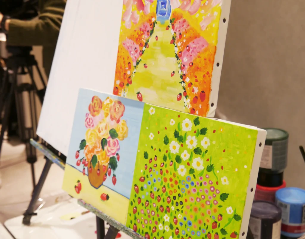 描く内容は、モネやゴッホ、クリムトの名画にいちご要素を加えた特別内容とのこと。「今まで経験がなくても誰でも描けますよ!」との言葉でも、思わず苦手意識から後ずさりそうになります。