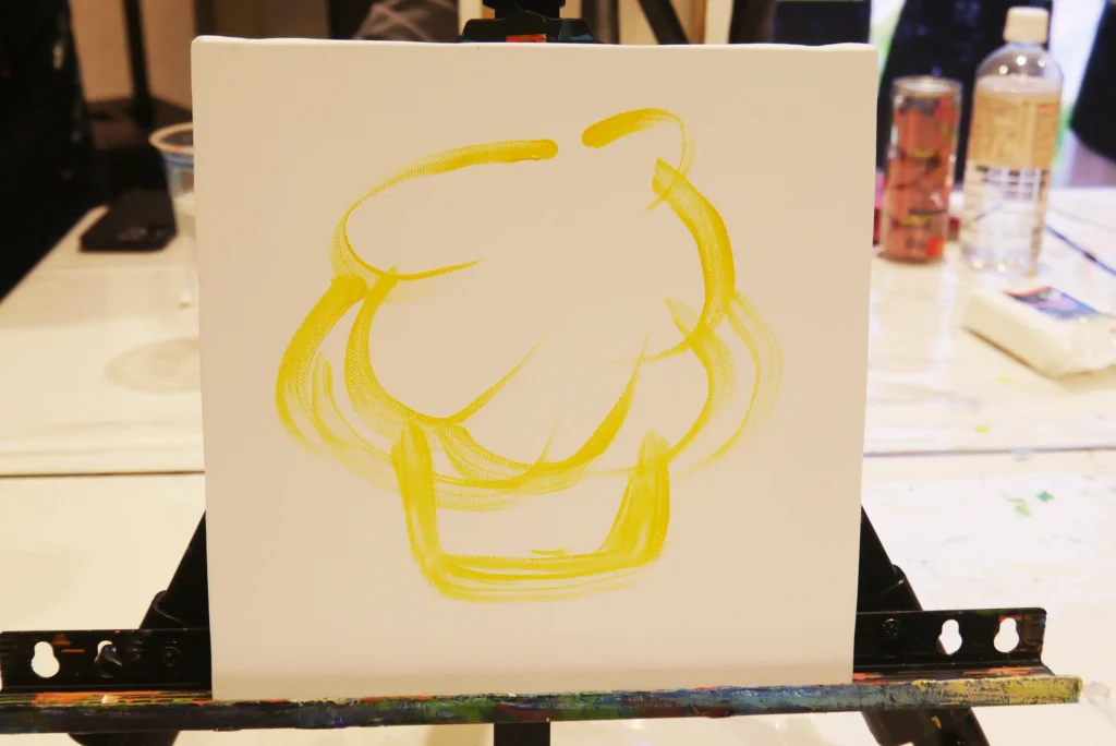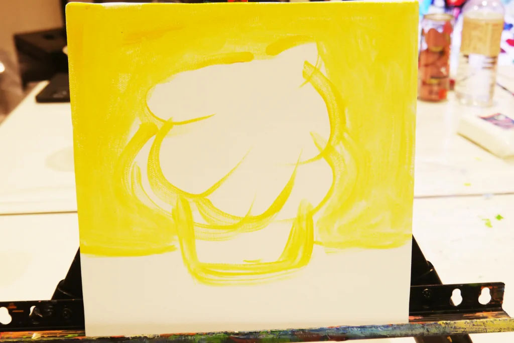 アクリル絵の具を使用して描く今回のイベント。アクリル絵の具は乾きやすく、乾いてから上に塗っても色がにごらないのが特徴なのだそう。塗りつぶしやすい黄色で大体の絵の構図を決めます。