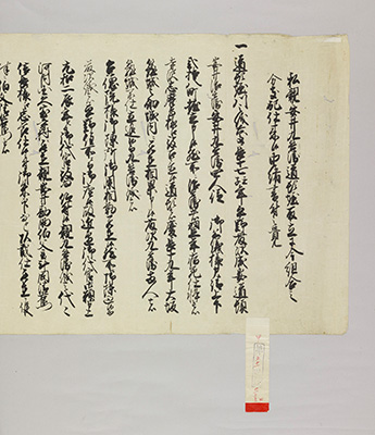 昭和45年(1970)開催の大阪万博を前に、大阪市による河川敷の改修工事が行われたが、これに対し昭和40年に安井家の子孫が道頓堀河川敷の所有権確認を求め提訴した。この安井家由緒書は、いわゆる「道頓堀裁判」の証拠資料として提出されたことで広く知られるようになった。下部の付箋はその際に付されたもの。上大和橋から川沿いを西に歩くことで、係争の跡地を感じることができる。
