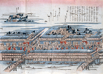 戎橋(えびすばし)と太左衛門橋の間の道頓堀南岸を描く江戸時代の一枚刷り。「中の芝居」の裏には法善寺が、「角の芝居」の遠景には高津宮(高津神社)が見える。芝居茶屋の店名まで詳細に記しているのが特徴だ。現在では「とんぼりリバーウォーク」になっており、川べりの地面が低いのは、傾斜を活かして階段状の雁木(がんぎ)を設けるなどして船をつけ、出入りをしていた名残である。