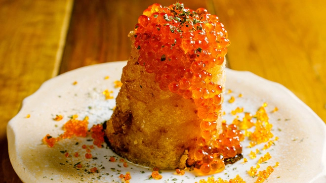 「梅田日本酒エビス」は、お料理も充実しています。特に、名物の「いくら大根」をお見逃しなく。3時間かけて炊き上げたおでんの大根を竜田揚げにし、いくらをふんだんにトッピングした逸品です。