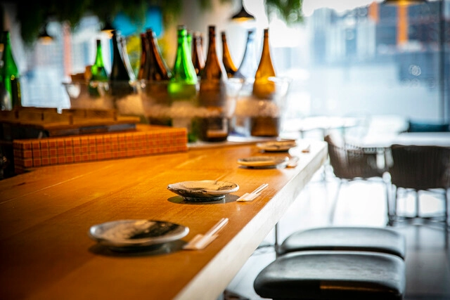 唎酒師が厳選した全国の地酒を常時30種以上揃えており、その時々で希少酒や季節限定酒も楽しめます。大きな窓から外の景色が眺められる開放的な店内には、カウンター席やハイチェアテーブルがあり、一人でもデートでも楽しめます。