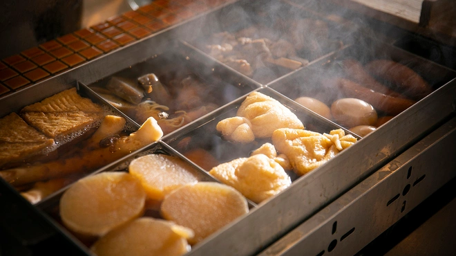 合わせるお料理のおすすめは関西おでん。カツオ・サバ・うるめをベースにその日仕入れた魚のアラを加えて取ったお出汁で煮込まれたおでんは、薄味ながらコク深い味わいです。ほか、大根ポルチーニや海老マヨ、山形から取り寄せる蕎麦など、美味しいメニューが多いと評判なんです。