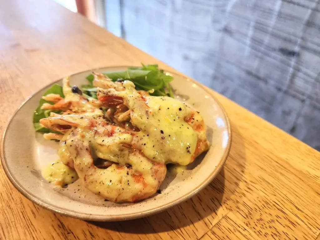 日本酒と相性のいいお料理もたくさん用意されています。本日のスポットメニューのほか「ソフトシェルシュリンプのバジルソースエビマヨ」や「徳島産肉厚しいたけのあぶり」など食欲をそそるメニューがたくさん。「フライドポテト カラスミとあおさバター」や「スパイスココナッツラーメン」など、創作性豊かな一品料理も充実しています。